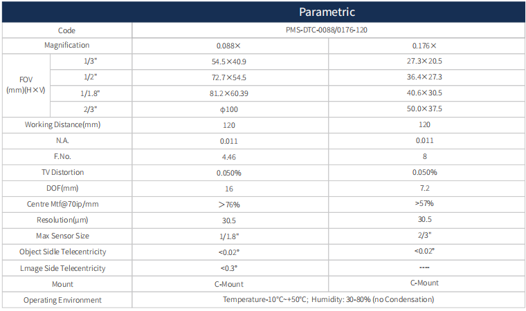 雙側雙倍遠心鏡頭0.088X & 0.176X,支持最大傳感器尺寸1/1.8" & 2/3",WD 120mm,F.No. 4.46&8, C接口