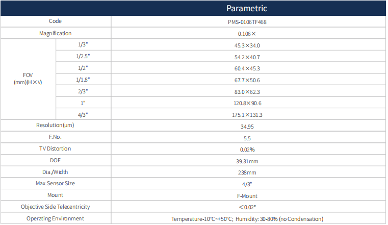POMEAS這款F接口大視野遠心鏡頭PMS-0106TF468 0.106X,支持最大傳感器尺寸4/3", WD 468mm.
