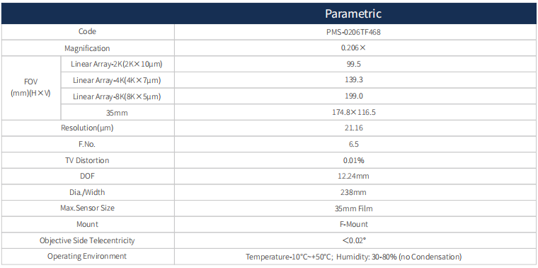 POMEAS這款F接口大視野遠心鏡頭 0.206X,支持最大傳感器尺寸35mm film, WD 468mm。