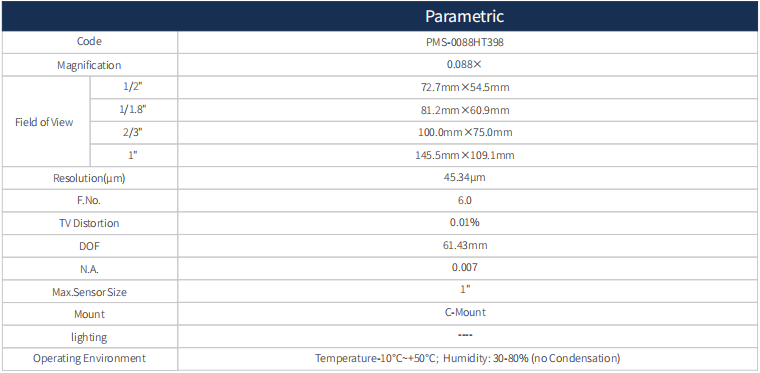 這款高分辨率遠心鏡頭 0.088X,支持最大傳感器尺寸1",WD 398mm,C接口。