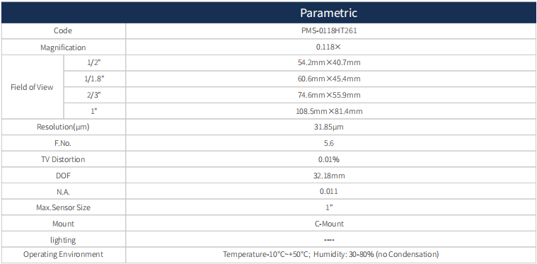 這款高分辨率遠心鏡頭 0.118X,支持最大傳感器尺寸1",WD 261mm,C接口。