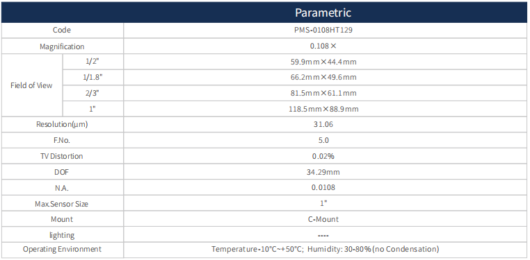 這款高分辨率遠心鏡頭 0.108X,支持最大傳感器尺寸1",WD 129mm,C接口。