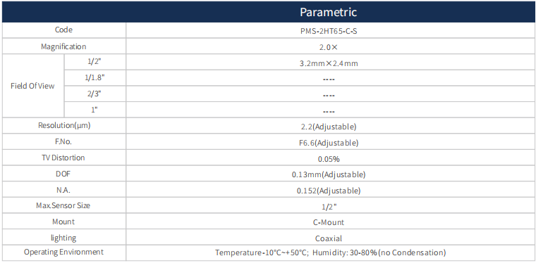 這款高分辨率同軸遠心鏡頭 2X,支持最大傳感器尺寸1/2",WD 65mm,C接口。