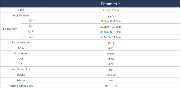 這款高分辨率遠心鏡頭 0.2X,支持最大傳感器尺寸1",WD 110mm,C接口。