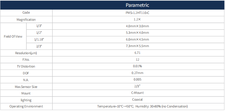 這款高分辨率同軸遠心鏡頭 1.2X,支持最大傳感器尺寸2/3",WD 110mm,C接口。