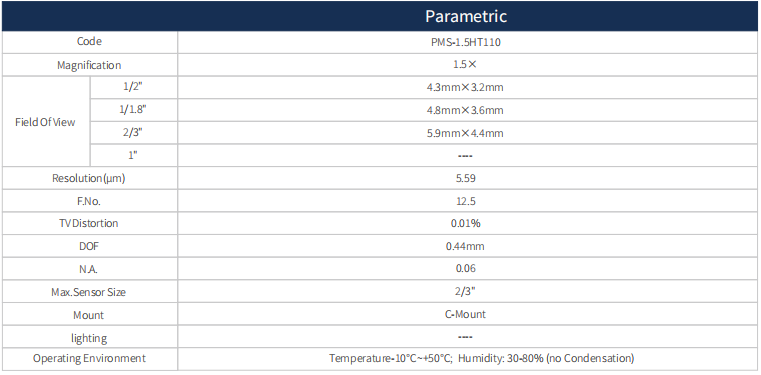 這款高分辨率遠心鏡頭 1.5X,支持最大傳感器尺寸2/3",WD 110mm,C接口。