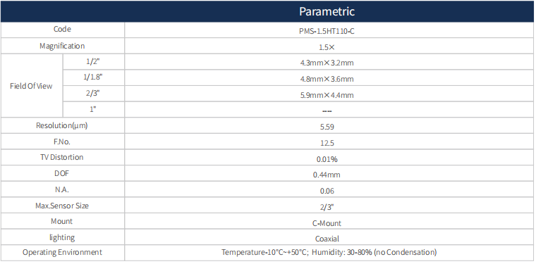 這款高分辨率同軸遠心鏡頭 1.5X,支持最大傳感器尺寸2/3",WD 110mm,C接口。