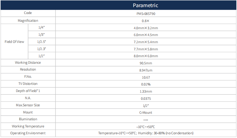 這款標準遠心鏡頭 0.8X,支持最大傳感器尺寸1/2“,WD 90.5mm,C接口。