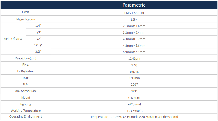 這款標準遠心鏡頭 1.5X,支持最大傳感器尺寸2/3“,WD 110mm,C接口。