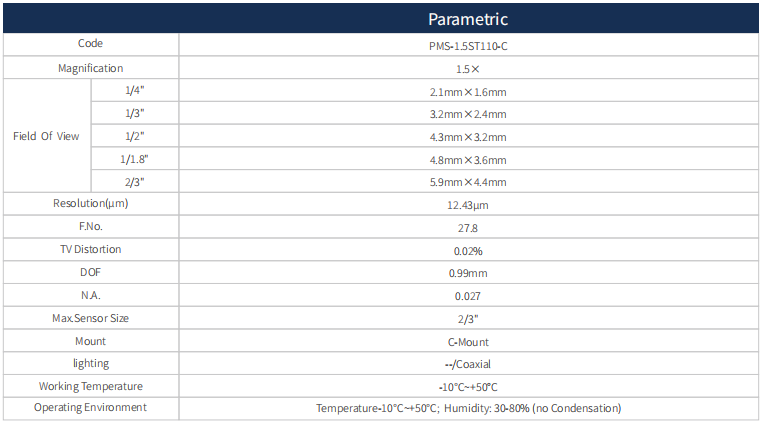 這款同軸標準遠心鏡頭 1.5X,支持最大傳感器尺寸2/3“,WD 110mm,C接口。
