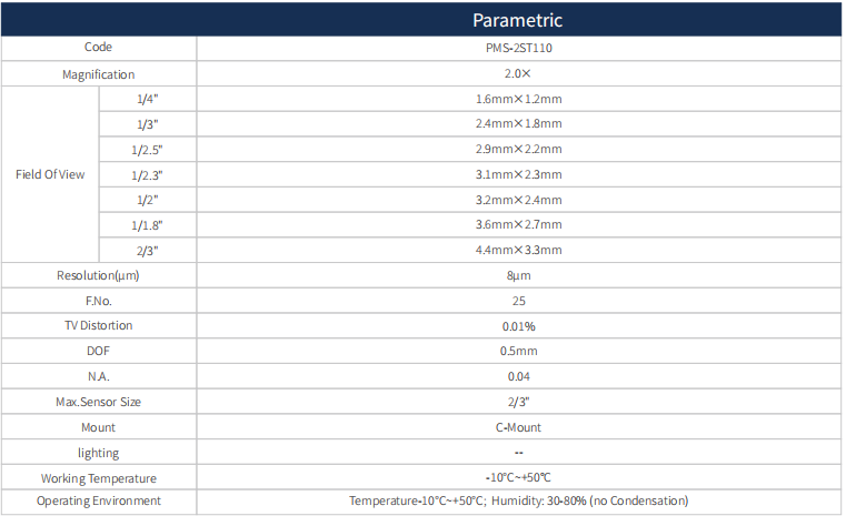 這款標準遠心鏡頭 2X,支持最大傳感器尺寸2/3“,WD 110mm,C接口。