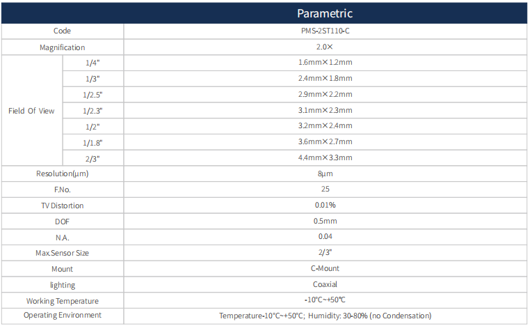 這款同軸標準遠心鏡頭 2X,支持最大傳感器尺寸2/3“,WD 110mm,C接口。