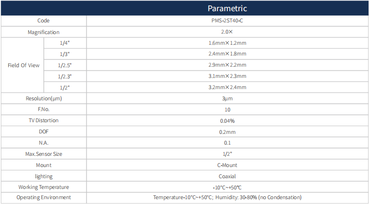 這款同軸標準遠心鏡頭 2X,支持最大傳感器尺寸1/2“,WD 40.4mm,C接口。