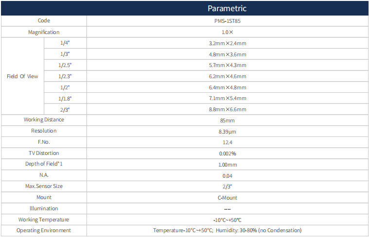 這款標準遠心鏡頭1.0X,支持最大傳感器尺寸2/3",85mm,C接口。