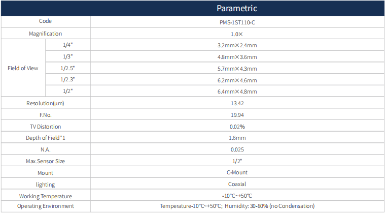 這款同軸標準遠心鏡頭 1X,支持最大傳感器尺寸1/2“,WD 110mm,C接口。
