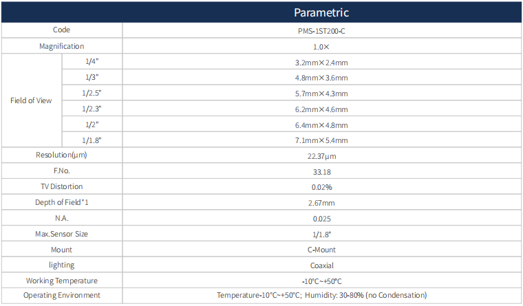 這款同軸標準遠心鏡頭 1X,支持最大傳感器尺寸1/1.8“,WD 200mm,C接口。