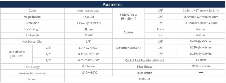 55MM遠心鏡頭參數表