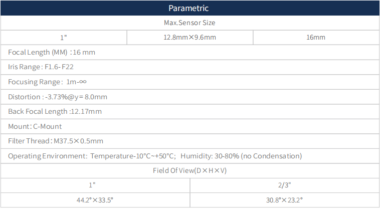 POMEAS這款500萬像素1" 機器視覺FA工業鏡頭,焦距16mm,光圈範圍F1.6-F22,成像範圍 1m- ∞.