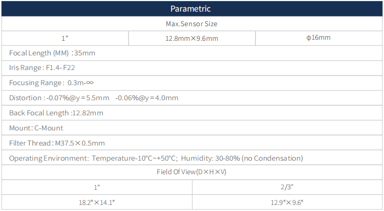 1.5MP 2/3’'機器視覺FA鏡頭,焦距35mm,光圈範圍F1.4-C,成像範圍0.30m-∞