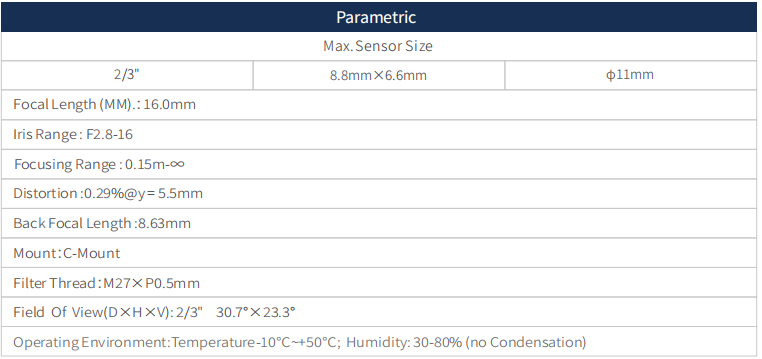 POMEAS這款1000萬像素2/3“機器視覺FA工業鏡頭,焦距16mm,光圈範圍F2.8~F16,對焦範圍0.15m~∞ 。