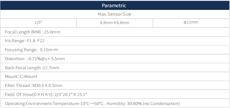 POMEAS這款1000萬像素2/3“機器視覺FA工業鏡頭,焦距25mm,光圈範圍F1.8~F22,對焦範圍0.15m~∞ 。