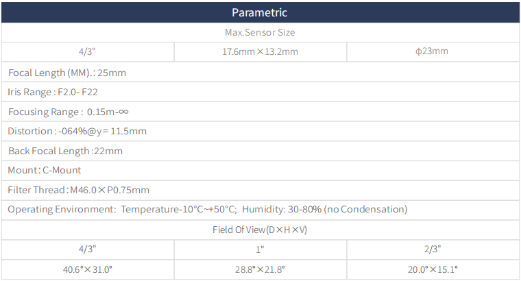 POMEAS這款1200萬像素4/3“機器視覺FA工業鏡頭,焦距25mm,光圈範圍F2.0-F22,成像範圍0.15m-∞。