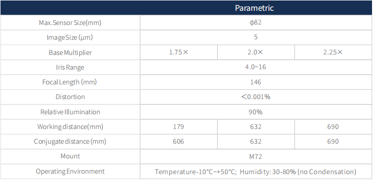 16K綫掃鏡頭最大支持φ82mm像面、超低畸變、防震設計、基準倍率覆蓋0.22X~3.5X。
