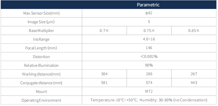 16K綫掃鏡頭最大支持φ82mm像面、超低畸變、防震設計、基準倍率覆蓋0.22X~3.5X。