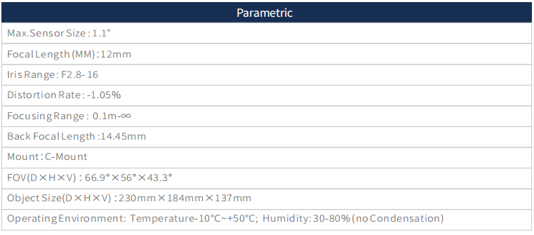 POMEAS這款2000萬像素1.1“機器視覺FA工業鏡頭,焦距12mm,光圈範圍F2.8~22,對焦範圍0.1m~∞.