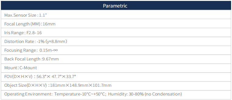 POMEAS這款2000萬像素1.1“機器視覺FA工業鏡頭,焦距16mm,光圈範圍F2.8~22,對焦範圍0.1m~∞.