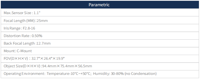 POMEAS這款2000萬像素1.1“機器視覺FA工業鏡頭,焦距25mm,光圈範圍F2.8~22,對焦範圍0.1m~∞.