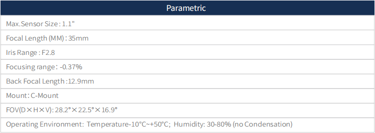 POMEAS這款2000萬像素1.1“機器視覺FA工業鏡頭,焦距35mm,光圈範圍F2.8~22,對焦範圍0.1m~∞.