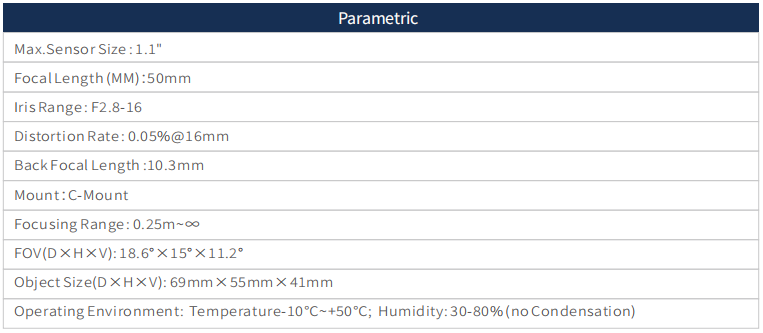 POMEAS這款2000萬像素1.1“機器視覺FA工業鏡頭,焦距25mm,光圈範圍F2.8~22,對焦範圍0.1m~∞.