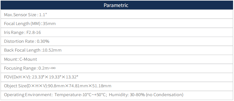 POMEAS這款2000萬像素1.1“機器視覺FA工業鏡頭,焦距35mm,光圈範圍F2.8~22,對焦範圍0.1m~∞.