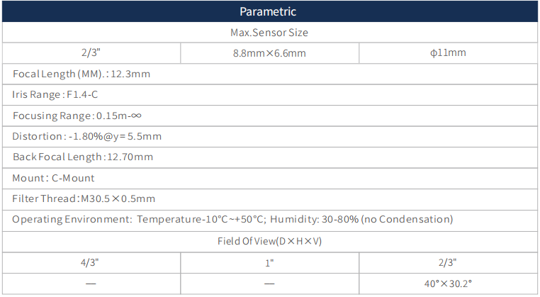 150萬像素 2/3",焦距12.3mm,光圈範圍F1.4-C,成像範圍 0.15m- ∞。機器視覺FA工業鏡頭