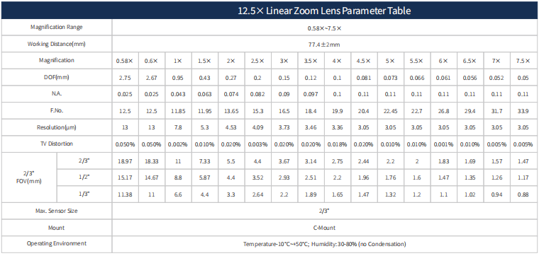 這款12.5X導軌變倍鏡頭12.5:1,0.58X-7.5X,支持最大傳感器尺寸2/3“,WD 77.4±2mm。