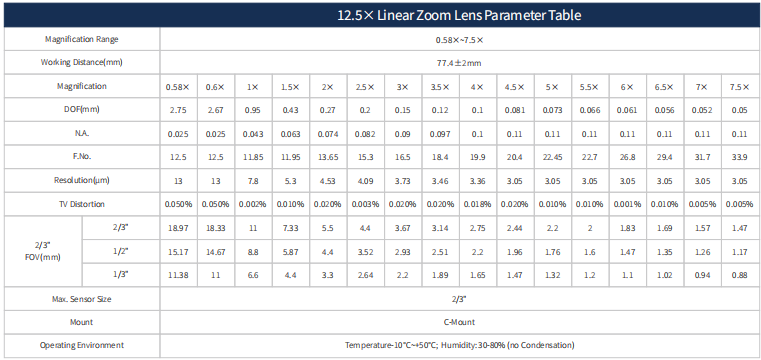 這款12.5X導軌變倍同軸光鏡頭 12.5:1,0.58X-7.5X,支持最大傳感器尺寸2/3“,WD 77.4±2mm。
