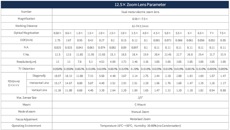 這款12.5X變倍鏡頭,12.5:1,可12mm微調,0.58X-7.5X,支持傳感器最大尺寸2/3“,WD 77.4±2mm。