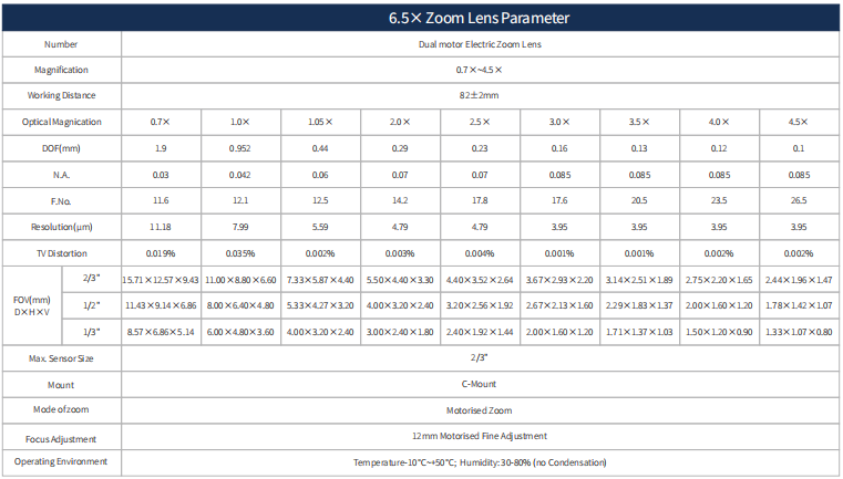 6.5X連續變倍鏡頭參數表