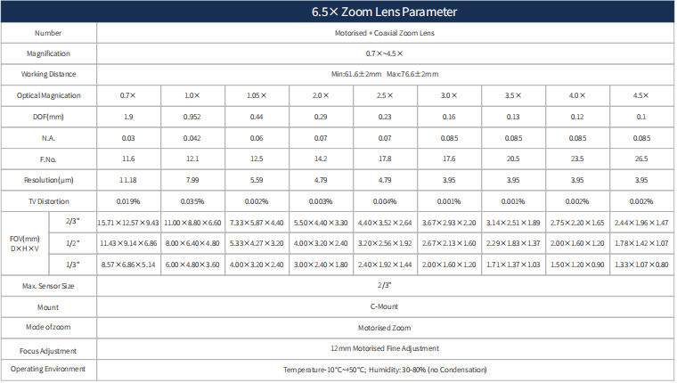 6.5X連續變倍鏡頭參數表