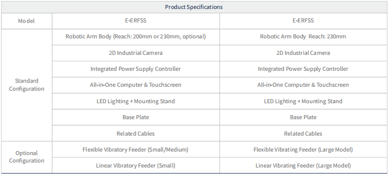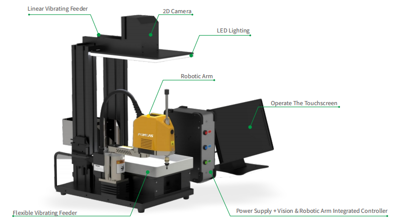 小型SCARA柔性上料機集視覺和機械臂操作系統為⼀體的高效自動化上料機器,可同時對不同形狀 ,尺寸 ,材質的多種物料進⾏精準識別和上料;外形小巧,適用於狹小空間。