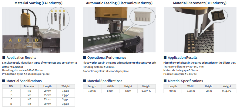 同時識別分揀5款工件,生產節拍=1.8~2.5S/PC。(含振動+拍照時間)