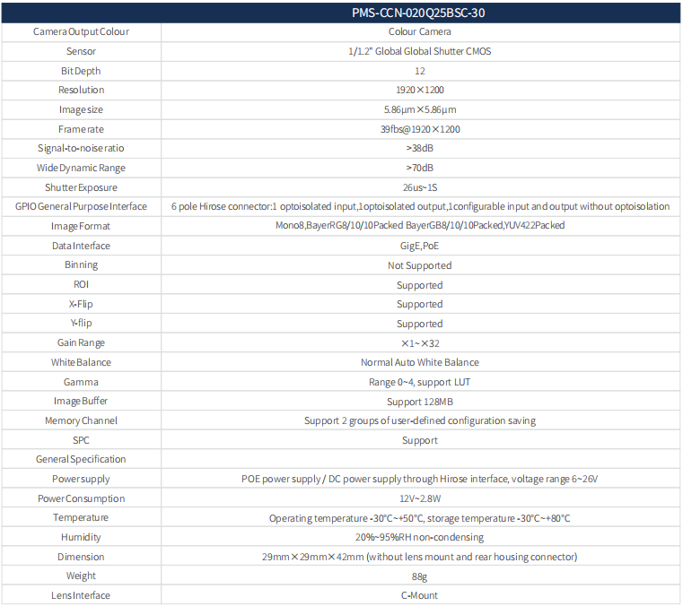 這款 200萬像素千兆網工業相機,像素可達1920x1200,黑白輸出,支持 1/1.2" CCD 傳感器,C 接口 。