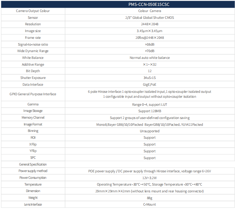 這款 500萬像素千兆網工業相機,CCD 類型,像素高達2448x2048,彩色輸出,支持 2/3" 傳感器,C 接口。