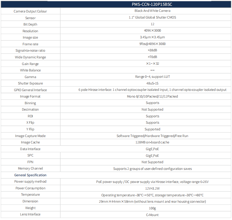 這款 1200萬像素千兆網工業相機,黑白輸出,CMOS 類型,支持1.1"傳感器,分辨率4096x3000。