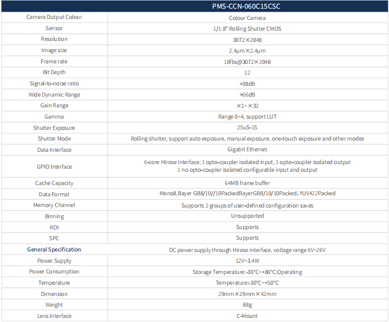 這款 600萬像素千兆網工業相機,像素高達3072x2048,彩色輸出,CCD類型,支持1/1.8"傳感器,C接口。