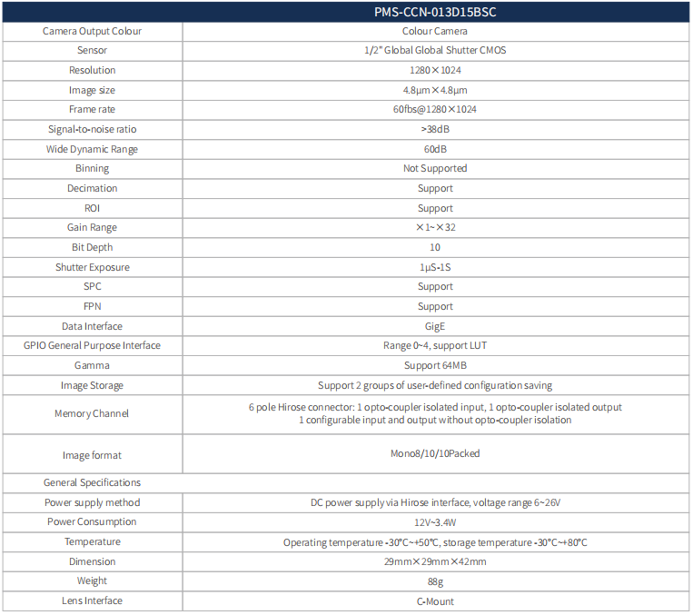 這款130萬像素千兆網工業相機,像素1280x1024,黑白輸出,支持1/2"CMOS傳感器,C接口。具有更低功耗和更小的體積,1000m bit/s穩定傳輸並兼容百兆網,低功耗,低噪聲。