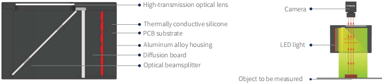 普密斯同軸光源使用高密度的LED陣列發射出高强度均勻光,通過一種帶特殊塗層的半透鏡面使工件上的反射光和CCD相機在同一個軸線上,並可消除採集園像的重像。